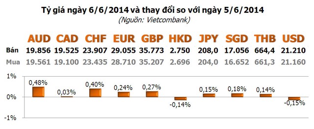 Các ngoại tệ khác chủ yếu tăng, mạnh nhất là AUD với 0,48%; tiếp đến là CHF với 0,40% GBP với 0,27%; EUR với 0,24%...