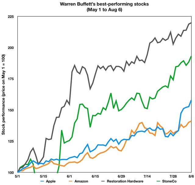 Thay vào đó, cổ phiếu có suất sinh lời tốt nhất của Warren Buffett từ đầu tháng 5 là Restoration Hardware, công ty bán lẻ đồ nội thất cao cấp. Cổ phiếu có suất sinh lời tốt theo sau là StoneCo, một công ty thanh toán kỹ thuật số của Brazil.