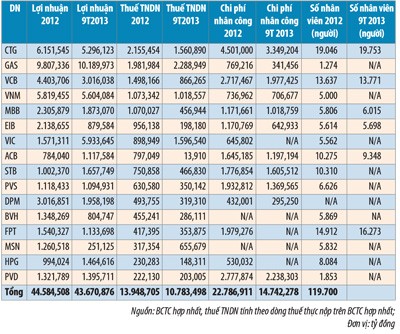 Năm 2012, nhóm các DN niêm yết có quy mô lợi nhuận sau thuế trên 1.000 tỷ đồng đóng góp trực tiếp và gián tiếp (qua hệ thống công ty con) khoảng 12.000 tỷ đồng thuế TNDN thực nộp. 9 tháng đầu năm 2013, TOP 15 DN niêm yết lớn trên TTCK đã nộp tới trên 10.326 tỷ đồng thuế TNDN.