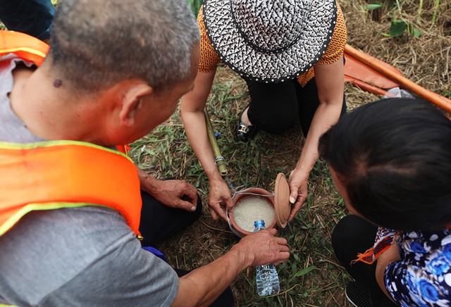 Sau phần thi bơi chải là thổi cơm trên thuyền, đây cũng là phần thi sôi nổi nhất. Chiếc niêu đất được cho gạo và nước vào, lấy dây buộc chặt, đắp đất sau đó dùng củi để đun.