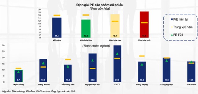 Tuy vậy, chuyên gia này cho rằng, cơ hội định giá hấp dẫn không trải đều ở các nhóm ngành. Nhóm vốn hoá lớn (VN30) đang có định giá PE thấp nhất (12,9 lần), các nhóm cổ phiếu vốn hoá vừa và nhỏ đang có P/E không rẻ (do giai đoạn vừa qua, nhóm này, nhất là các cổ phiếu trên UPCoM có diễn biến tăng tốt, khiến định giá tăng lên). Theo định giá PB thì hầu hết các ngành đều đang có định giá cao hơn trung bình thị trường, chỉ có ngân hàng là thấp nhất.