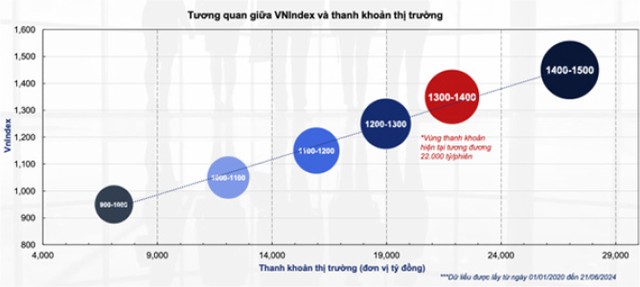 Giai đoạn trước năm 2016, số lượng tài khoản chứng khoán tầm 1,6 triệu thì thanh khoản thị trường chỉ khoảng 2.000 - 3.000 tỷ đồng/phiên. Còn hiện nay, số lượng tài khoản đạt con số gần 8 triệu, mỗi tháng nhà đầu tư mở mới trung bình 100.000 - 120.000 tài khoản thì thanh khoản ở quanh mức 1 tỷ USD/phiên. Theo ông Trung, dựa trên thống kê trong 5 năm gần nhất, với mức thanh khoản duy trì quanh 22.000 tỷ đồng, VN-Index thường giao dịch ở vùng 1.300 - 1.400 điểm. Còn thị trường tạo đỉnh năm 2022, thanh khoản đột biến 25.000 - 30.000 tỷ đồng/phiên.