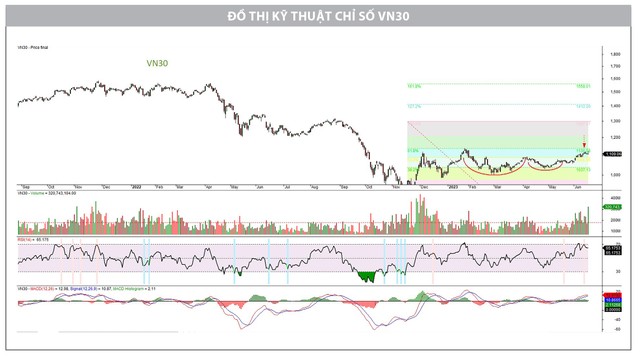 Đồ thị nến từ VN30 chốt phiên cuối tuần qua không thật sự tích cực khi chạm cản kháng cự từ Fibonacci và đưa ra hiệu ứng rút nến. Với thanh khoản cao, có thể áp lực bán chốt lời xuất hiện trên diện rộng. Nhưng một lần nữa, một phiên bán chưa khiến cho đà tăng bị ảnh hưởng nhiều, do chỉ số đã có thời gian dài tích lũy.
