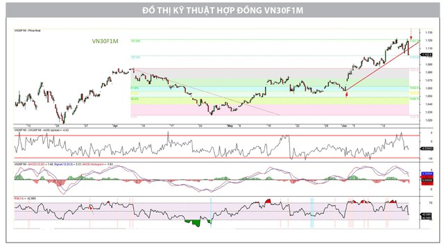Chỉ báo vênh Basis thể hiện rõ cho quan sát này khi giảm mạnh từ mức vênh dương. Nói cách khác, bên mua hiện thực hóa lợi nhuận khi phát hiện mức độ hưng phấn có phần quá đà trong phiên. Mặc dù vậy, bên bán cũng có lý do để tham gia khi RSI cho tín hiệu phân kỳ âm rõ nét và điều chỉnh từ vùng quá mua. Bên cạnh đó, tín hiệu từ MACD góp phần khẳng định việc thị trường hạ nhiệt là cần thiết, khi dòng tiền mới tham gia vào thị trường phái sinh không còn sôi động như trước.