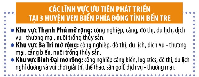 Nghị quyết Đại hội Đảng bộ tỉnh Bến Tre nhiệm kỳ 2020-2025 đặt trọng tâm phát triển tỉnh về hướng Đông là nhiệm vụ then chốt, đột phá. Tỉnh cũng đã khai thác và phát huy những thế mạnh kinh tế biển của 3 huyện ven biển Bình Đại, Ba Tri, Thạnh Phú... Trong đó, hướng đến nuôi trồng, đánh bắt thủy hải sản, cảng cá, phát triển các khu công nghiệp, cụm công nghiệp ven biển, phát triển du lịch biển...