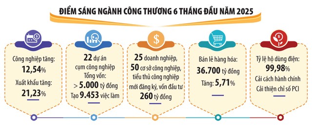 Trong 6 tháng đầu năm 2025, các đơn vị trong ngành đã triển khai hiệu quả nhiệm vụ theo kế hoạch, thực hiện tốt chỉ đạo của lãnh đạo các cấp, theo dõi sát diễn biến cung - cầu, giá cả hàng hóa, kịp thời tháo gỡ khó khăn cho doanh nghiệp. Giá trị sản xuất công nghiệp, tổng mức bán lẻ và kim ngạch xuất khẩu đều tăng khá so với cùng kỳ. Nguồn cung hàng hóa phong phú, đáp ứng tốt nhu cầu tiêu dùng, nhất là dịp lễ, tết.