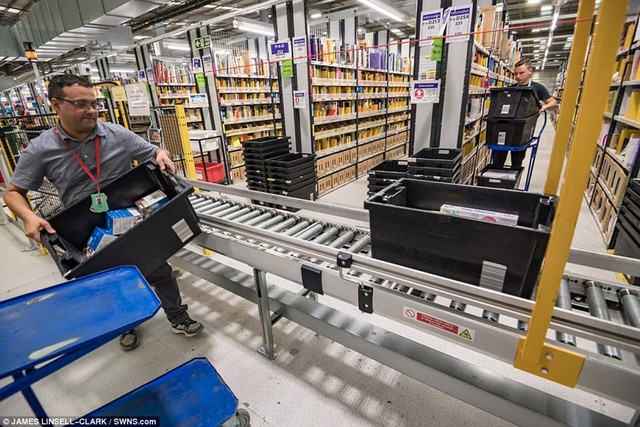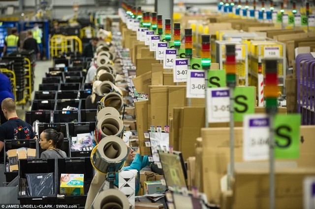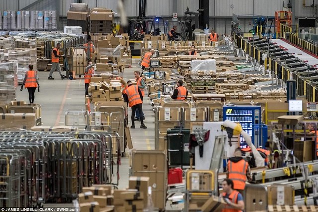 Với kích thước bằng 7 sân bóng đá, một kho hàng của Amazon tại Anh có thể xuất đi 85 sản phẩm mỗi giây. Dưới đây là khung cảnh tấp nập tại kho hàng trước Black Friday.