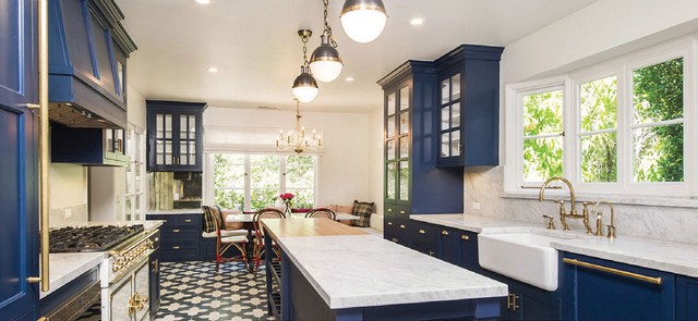 Nếu bạn muốn biến gian bếp thành khu vực nổi bật của ngôi nhà, màu xanh navy sẽ là một trợ thủ đắc lực nếu được dùng làm tông màu chính cho các nội thất như tủ bếp, bàn ăn, nền gạch, đặc biệt là khi kết hợp với sắc trắng sáng và ánh vàng điểm xuyết từ những phần còn lại trong căn phòng.