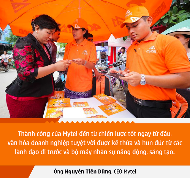 Ông Nguyễn Tiến Dũng, Tổng giám đốc Mytel chia sẻ: “Thành công của Mytel đến từ chiến lược tốt ngay từ đầu, văn hóa doanh nghiệp tuyệt vời được kế thừa và hun đúc từ các lãnh đạo đi trước và bộ máy nhân sự năng động, sáng tạo. Từ khi thành lập đến nay, chưa có thời điểm nào là dễ dàng với Mytel cả. Dù hoàn cảnh chính trị, an ninh an toàn phức tạp; nhưng người Mytel luôn giữ vững quyết tâm, vượt mọi thách thức, tìm ra các cách làm mới, đột phá để hoàn thành tốt mọi mục tiêu đã đề ra”.