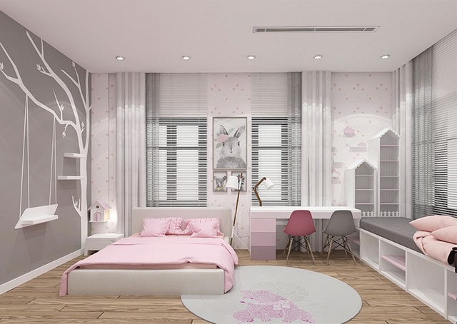 Khi thiết kế và thi công, các bậc phụ huynh nên để ý với tông màu ngọt ngào, thiết kế thêm khung cửa sổ rộng lớn, ánh sáng hướng vào phòng tạo cảm giác tươi sáng, ấm áp cho căn phòng. Giấy dán tường, rèm cửa, chăn ga cùng họa tiết và màu sắc cho căn phòng tông - sặc - tông. Từ đó, các bé chắc hẳn sẽ yêu thích căn phòng ngọt ngào đáng yêu này và coi căn phòng là một không gian kín mà thành thiên đường riêng của bé.