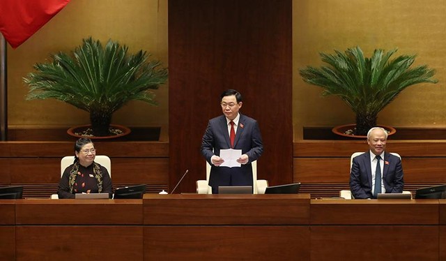 Quốc hội ghi nhận lời tuyên thệ của Chủ tịch Quốc hội Vương Đình Huệ, bà Nguyễn Thị Kim Ngân nói. Sau đó bà Kim Ngân tặng hoa chúc mừng người kế nhiệm.