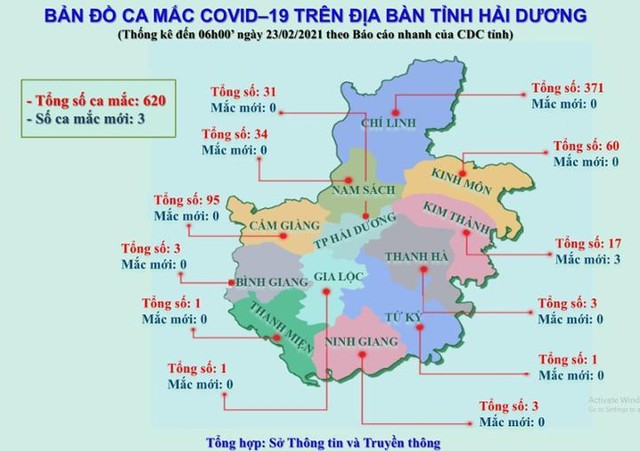 Theo báo cáo từ Ban Chỉ đạo phòng, chống dịch Covid-19 tỉnh Hải Dương, tính đến 6h ngày 23/02, tỉnh Hải Dương ghi nhận thêm 3 ca dương tính với virus SARS-CoV-2. Đây là các trường hợp F1 tại ổ dịch Kim Liên, Kim Thành, đều đã được cách ly tập trung trước đó. Hiện các bệnh nhân được cách ly, điều trị tại Bệnh viện Dã chiến số 2 Trường Đại học Kỹ thuật Y tế Hải Dương.