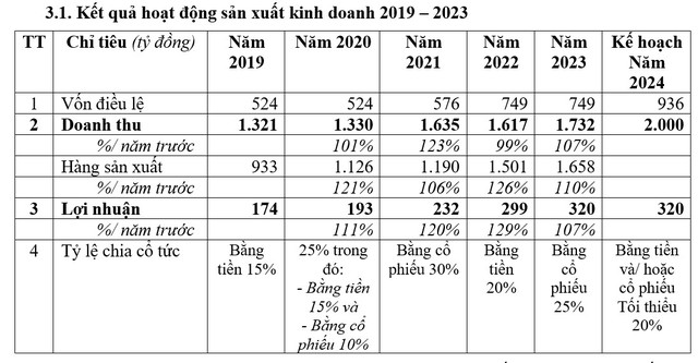 ĐHCĐ cũng có tờ trình phát hành cổ phiếu để trả cổ tức năm 2023, tỷ lệ 25%, tương ứng sẽ phát hành thêm hơn 18,7 triệu cổ phiếu, qua đó, nâng vốn điều lệ lên gần 936 tỷ đồng. Nguồn thực hiện từ lợi nhuận sau thuế chưa phân phối tính đến thời điểm 31/12/2023 theo BCTC kiểm toán.