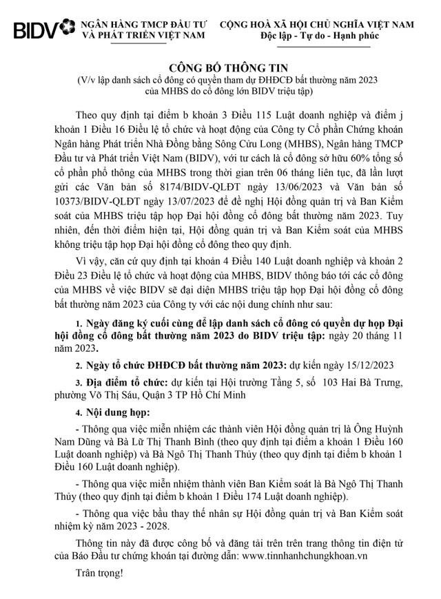 BIDV thông báo lập danh sách cổ đông có quyền tham dự ĐHĐCĐ bất thường 2023 của MHBS cổ đông lớn BIDV triệu tập