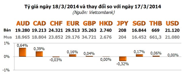 Với các ngoại tệ khác, đa số tăng, nhưng chỉ có AUD và CAD tăng đáng kể với tương ứng 0,64% và 0,39%. Duy nhất JPY giảm, với -0,32%.
