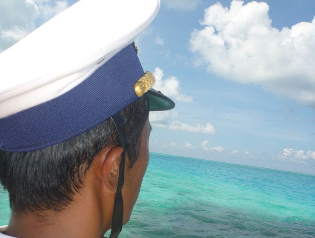 Quả thật, đúng 8 giờ sáng mùng 2/5, khi con tàu Trường Sa HQ 571 lừng lững vươn khơi, thì càng xa bờ, sóng lại càng êm đềm. Nhìn ra mênh mông, biển xanh ngăn ngắt, nắng lại vàng rực rỡ, lăn tăn vài đọn sóng mà nói không ngoa, còn dịu êm hơn mặt Hồ Tây những ngày giông gió.