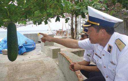 Chuẩn Đô đốc Đặng Minh Hải bên giàn bí tăng gia của chiến sĩ đảo Sinh Tồn Đông