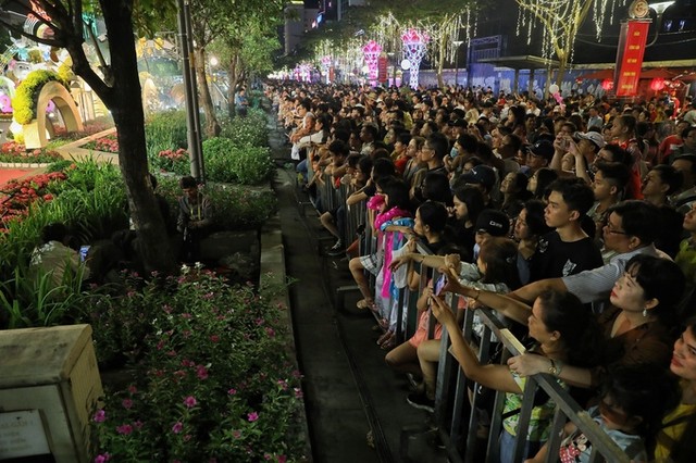 Hơn 22h, đường hoa vẫn rất đông người dân, du khách tới vãn cảnh.Đường hoa Nguyễn Huệ mở cửa đến 21h ngày 28/1/2020 (tức mùng 4 Tết).