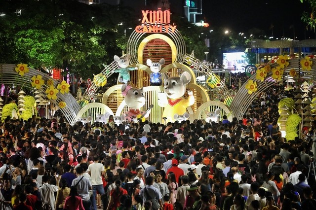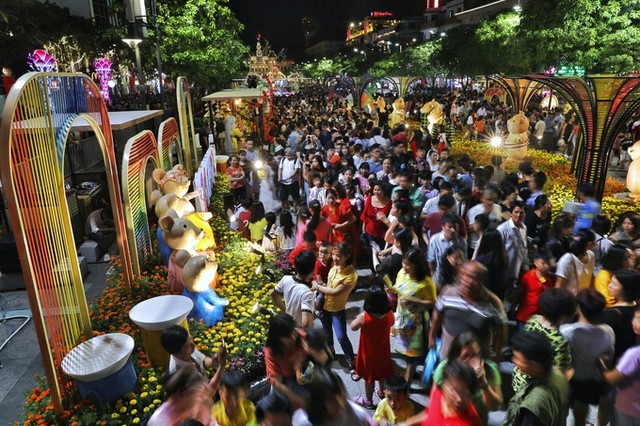 Dưới tiểu cảnh Gia đình chuột ca hát mừng xuân - đoạn đầu của đường hoa - chật kín người tham quan, chụp ảnh lưu niệm.
