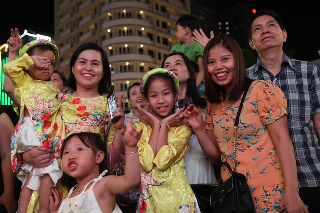 Gia đình chị Thuỷ (huyện Bình Chánh) nhí nhảnh tạo dáng chụp hình bên đường hoa. "Ở Sài Gòn Tết đến không biết đi đâu chơi, năm nào tôi cùng đưa gia đình ra đây dạo phố ngắm hoa, mấy đứa nhỏ nó vui lắm", chị Thuỷ nói.
