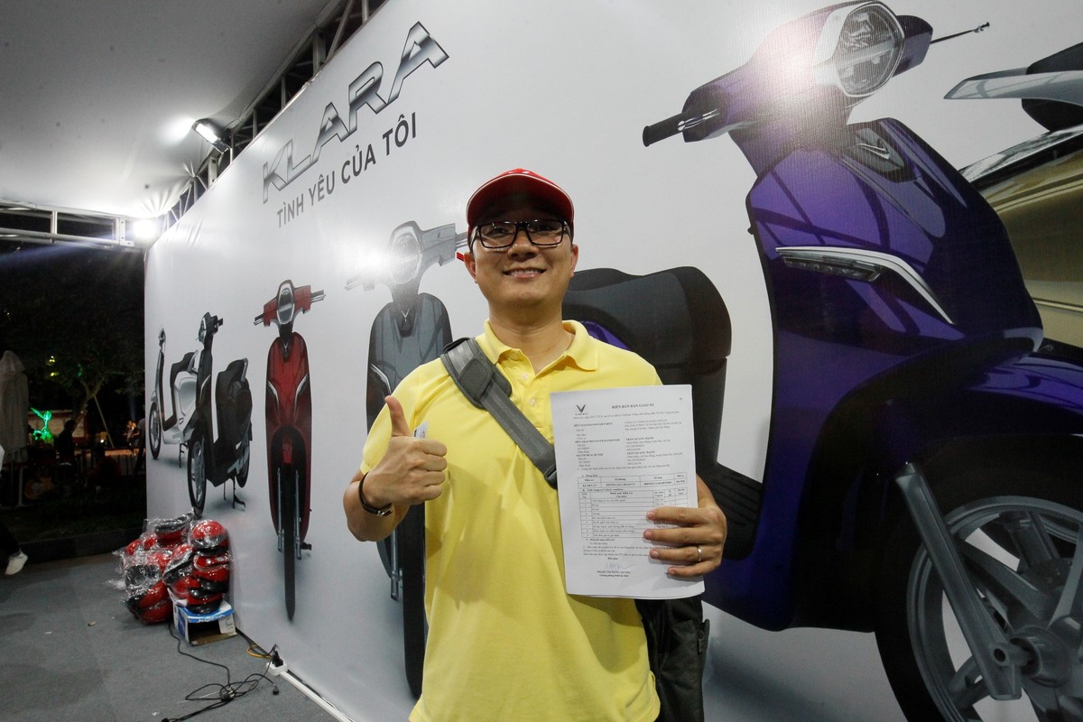 Còn với xe máy điện, khách hàng có thể ngay lập tức trả toàn bộ tiền và mang xe về nhà. Trong ảnh là anh Trần Quang Mạnh, một trong những khách hàng đầu tiên, mua 2 xe Klara cho mẹ và vợ với giá 70 triệu đồng.