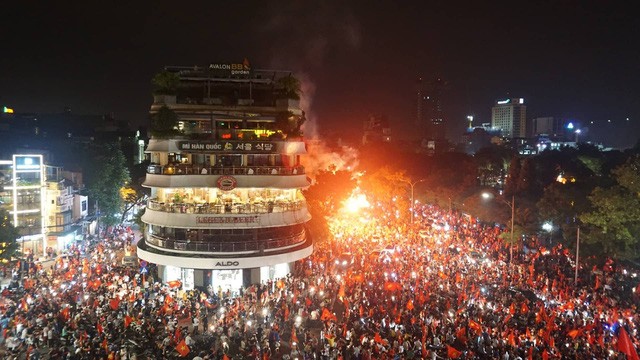 Hồ Hoàn Kiểm rực sắc đỏ sau chiến thắng lịch của các cầu thủ U23