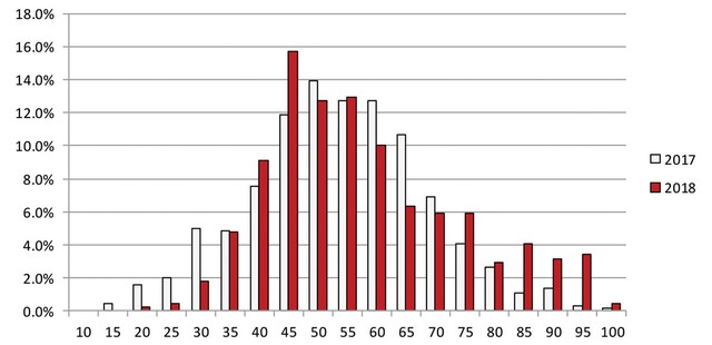 Phân phối phổ điểm của giải cho thấy tỷ lệ báo cáo có điểm cao (trên 75% tổng số điểm) nhiều hơn hẳn so với năm 2017 và tỷ lệ số báo cáo có tỷ lệ điểm thấp (dưới 35% tổng số điểm) thấp hơn so với năm 2017. Điều này cho thấy sự thay đổi tích cực trong chất lượng báo cáo thường niên của năm 2018 so với năm 2017.