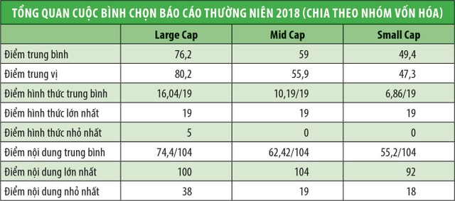 Điểm sáng cần khích lệ là điểm nội dung cao nhất ở nhóm small cap đạt 92/104 cũng là mức điểm cao, cho thấy một số doanh nghiệp nhỏ đã có sự đầu tư thích hợp cho việc lập báo cáo thường niên và thông tin ra thị trường.