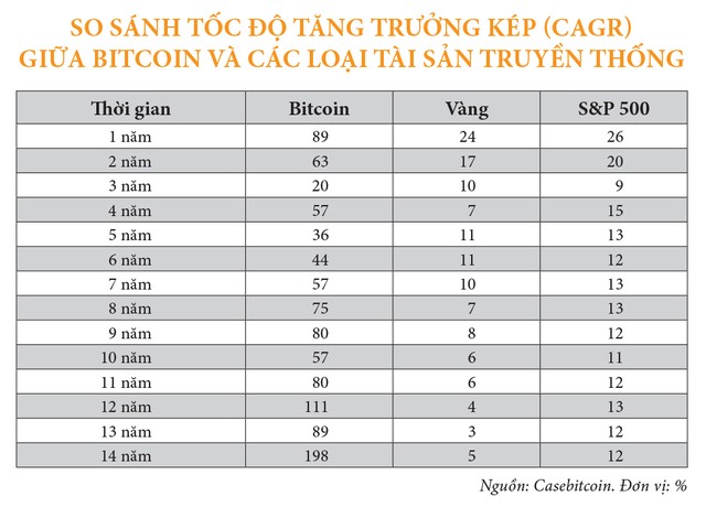 Thống kê từ trang phân tích số liệu Casebitcoin, trong 14 năm qua, Bitcoin là loại tài sản có tốc độ tăng trưởng kép (CAGR) vượt trội so với các loại tài sản truyền thống như vàng hay chứng khoán Mỹ.