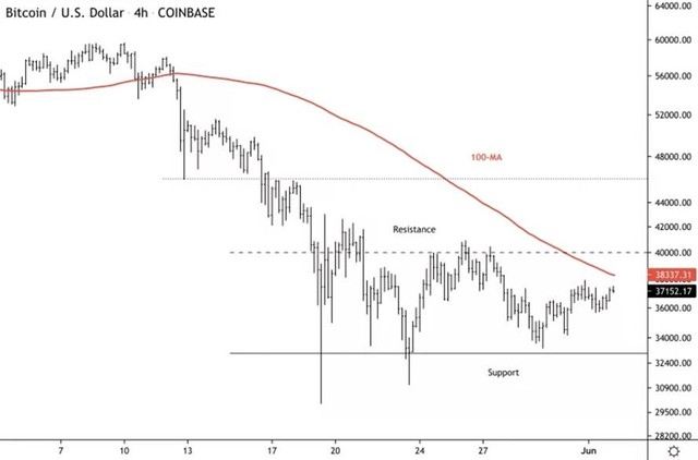 Bitcoin đang tiến gần đến ngưỡng kháng cự gần đường trung bình chuyển động 100 kỳ (tính đến thời điểm viết bài là 38.337 USD) trên biểu đồ hàng giờ. Giai đoạn giá của đồng BTC liên tục lao dốc vào tháng 5 hiện vẫn còn đang gây ảnh hưởng nhiều đến tâm lý của nhà đầu tư mặc dù áp lực bán trong tuần qua đã giảm.