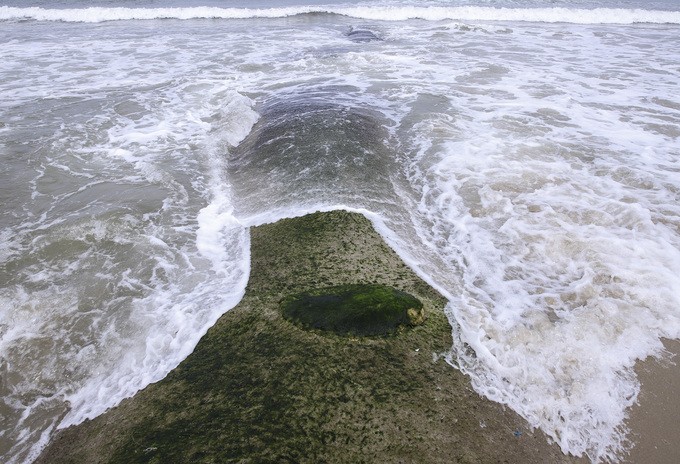 Khi bồi trở lại, cát đã phủ hết lên tuyến đê bao phía dưới, nhưng hiện sóng đã cuốn cát ra xa.