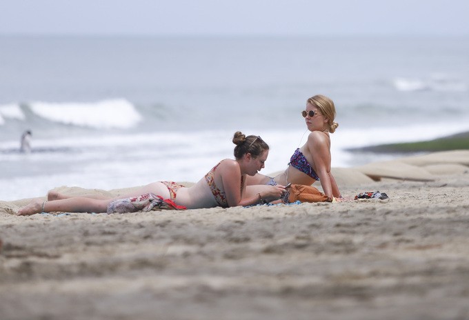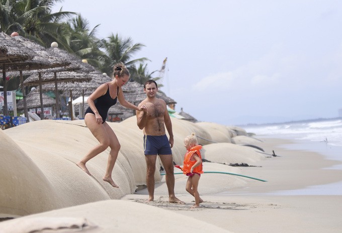 Vào mùa thấp điểm du lịch, du khách ở Cửa Đại chủ yếu đến từ châu Âu. Không còn bãi biển trải dài, nhiều người phải tắm nắng ngay sát đê bao.