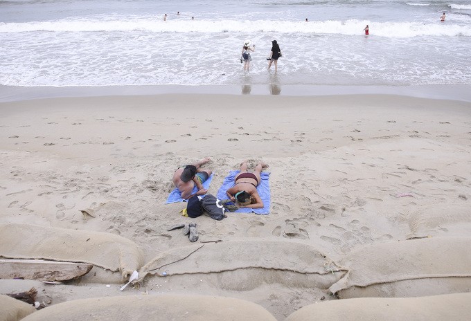 Một số du khách trải tấm vải để tắm nắng ngay trên đê. Nhờ tuyến đê này mà hàng dừa ở Cửa Đại không tiếp tục bị sóng cuốn đi.