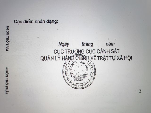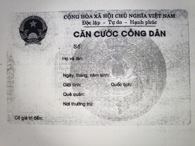 Bên phải, từ trên xuống: CỘNG HÒA XÃ HỘI CHỦ NGHĨA VIỆT NAM, Độc lập - Tự do - Hạnh phúc; dòng chữ “CĂN CƯỚC CÔNG DÂN”; số; họ và tên; ngày, tháng, năm sinh; giới tính; quốc tịch; quê quán; nơi thường trú.