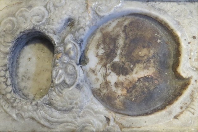 Chiếc nghiên mực làm bằng đá được khắc họa tiết rồng thời nhà Nguyễn.