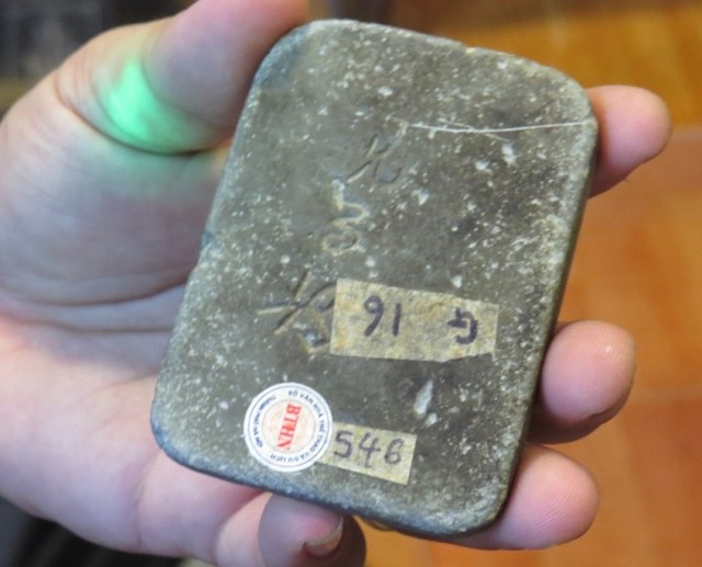 Chiếc nghiên mực làm bằng đá đen, không có họa tiết nào đặc biệt, anh Thiện Gia cho rằng, người sử dụng nó thuộc tầng lớp bình dân.