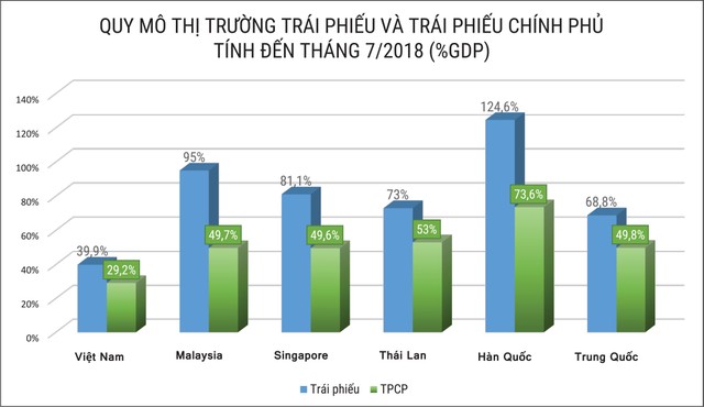 Theo Bộ Tài chính, đến tháng 7/2018, quy mô thị trường trái phiếu Việt Nam là 39,9% GDP năm 2017, trong đó thị trường TPCP chiếm 29,2% GDP. Trong khi đó, quy mô thị trường trái phiếu của Malaysia là 95% GDP (thị trường TPCP chiếm 49,7% GDP); Singapore là 81,1% GDP, trong đó thị trường TPCP chiếm 49,6% GDP...