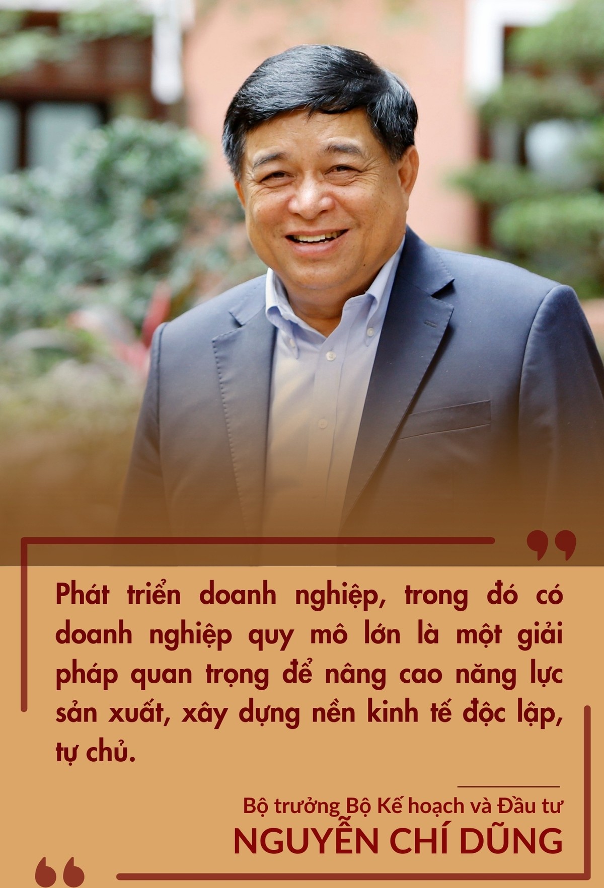 Bởi thế, tôi cho rằng, đây là thời điểm phù hợp để khơi thông nguồn lực, phát huy vị trí, vai trò của doanh nghiệp quy mô lớn trong giai đoạn phục hồi và phát triển kinh tế - xã hội của đất nước. Với góc nhìn đó, Bộ Kế hoạch và Đầu tư đang đề xuất với Thủ tướng Chính phủ về việc nghiên cứu Đề án Xây dựng cơ chế, chính sách hình thành và phát triển doanh nghiệp dân tộc nhằm phát huy vai trò tiên phong trong một số ngành, lĩnh vực mới nổi, có lợi thế cạnh tranh nhằm xây dựng nền kinh tế độc lập, tự chủ. Đề án dự kiến nghiên cứu, lựa chọn các ngành, lĩnh vực Việt Nam có lợi thế cạnh tranh để đi tắt, đón đầu, trở thành ngành công nghiệp tương lai của đất nước, như điện gió ngoài khơi, amoniac, hydrogen xanh, sản xuất thép, sản xuất ô tô điện, công nghiệp điện tử viễn thông, công nghiệp bán dẫn, kết cấu hạ tầng quan trọng quốc gia…