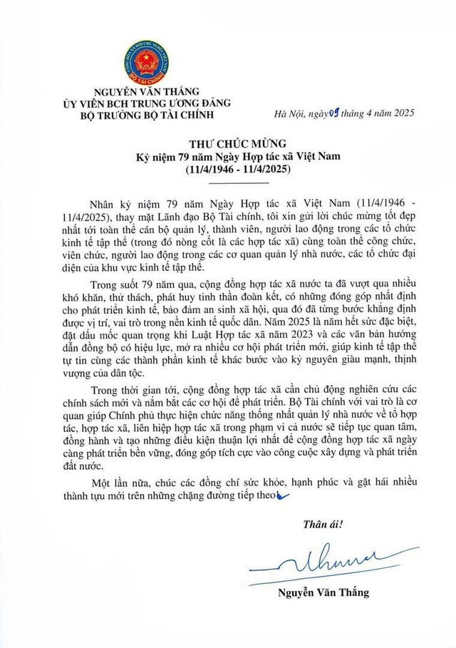 Nhân kỷ niệm 79 năm Ngày Hợp tác xã Việt Nam (11/4/1946 - 11/4/2025), thay mặt Lãnh đạo Bộ Tài chính, đồng chí Nguyễn Văn Thắng, Ủy viên Ban Chấp hành Trung ương Đảng, Bí thư Ban Cán sự Đảng, Bộ trưởng Bộ Tài chính gửi Thư chúc mừng tới các cán bộ quản lý, thành viên, người lao động trong các tổ chức kinh tế tập thể (trong đó nòng cốt là các hợp tác xã) cùng toàn thể công chức, viên chức, người lao động trong các cơ quan quản lý nhà nước, các tổ chức đại diện của khu vực kinh tế tập thể. Báo Tài chính Đầu tư xin trân trọng giới thiệu toàn văn Thư chúc mừng.