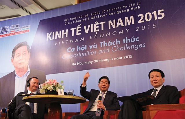 Nói về nền kinh tế Việt Nam 2015, Bộ trưởng đánh giá nước ta đang đứng trước nhiều cơ hội. Đầu tiên là kinh tế vĩ mô ổn định vững chắc hơn trong quý I/2015, khi GDP tăng trưởng 6,03%, chỉ số giá tiêu dùng (CPI) âm 0,1%. CPI giảm không phải do giảm phát, mà trên thực tế kinh tế vẫn tăng trưởng, phục hồi sản xuất rõ nét, thể hiện qua chỉ số phát triển sản xuất công nghiệp chế biến, chế tạo tăng trên 9% so với cùng kỳ năm trước. GDP tăng 6,03% là mức tăng cao hơn nhiều so với cùng kỳ nhiều năm qua. “Đây là con số tính toán rất chặt chẽ, tôi chỉ đạo Tổng cục Thống kê phải tính toán GDP chặt theo thông lệ quốc tế, để đảm bảo phản ánh chính xác tình hình kinh tế, từ đó để có chính sách đúng. Tăng trưởng kinh tế đang phục hồi. Nếu không có gì đột biến, thì GDP năm nay sẽ đạt 6,2 - 6,3%, nếu nỗ lực có thể đạt 6,3 - 6,4%...”, Bộ trưởng Bùi Quang Vinh dự báo.