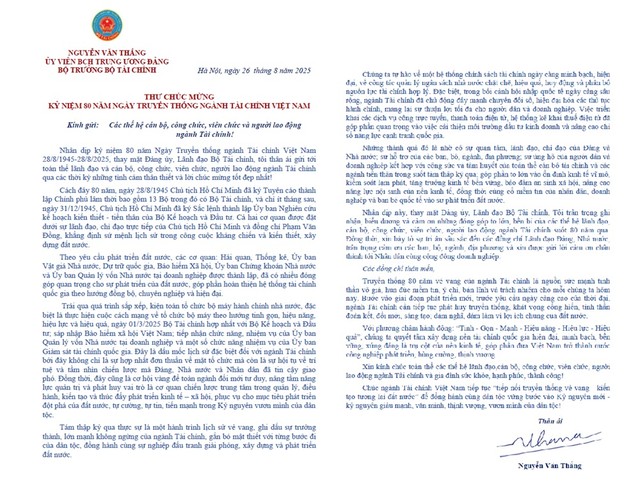 Trong thư, Bộ trưởng Bộ Tài chính Nguyễn Văn Thắng nhấn mạnh: Nhân dịp kỷ niệm 80 năm Ngày Truyền thống ngành Tài chính Việt Nam (28/8/1945 - 28/8/2025), thay mặt Đảng ủy, Lãnh đạo Bộ Tài chính, tôi thân ái gửi tới toàn thể lãnh đạo và cán bộ, công chức, viên chức, người lao động ngành Tài chính qua các thời kỳ những tình cảm thân thiết và lời chúc mừng tốt đẹp nhất!