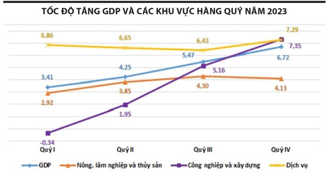 Theo Tổng cục Thống kê, GDP quý IV/2023 ước tăng 6,72%, gần gấp đôi mức tăng 3,41% của quý I, tính chung cả năm 2023 tăng 5,05%. Đây là tín hiệu tích cực trong bối cảnh kinh tế thế giới đối mặt với tình trạng lạm phát và suy thoái, sức mua giảm và hoạt động thương mại trầm lắng. Nhóm công nghiệp và xây dựng phục hồi đáng kể khi tăng trưởng được cải thiện dần qua từng quý, từ mức -0,34% của quý I đến mức 7,35% của IV.