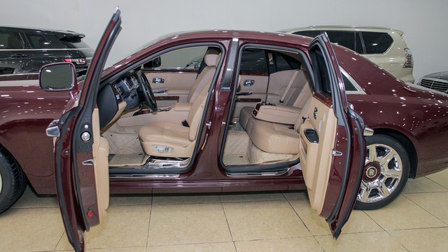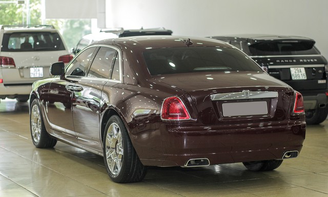 Rolls-Royce Ghost màu đỏ ruby từng thuộc sở hữu của một đại gia ở Hải Phòng, xuất hiện trong một showroom trên đường Phạm Hùng, Hà Nội. Xe thuộc serie I, còn khá mới, chỉ lăn bánh 22.906 km dù qua gần 5 năm sử dụng.