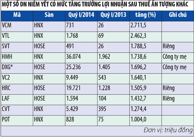 Tương tự, một số doanh nghiệp cũng có lợi nhuận sau thuế trong quý I/2014 tăng ấn tượng khác như CTCP Đầu tư Thương mại Thủy sản (ICF), tăng trưởng 6.395%, CTCP Kỹ nghệ Đô Thành (DTT), tăng 3.591%, CTCP Sông Đà 10.1 (SNG), tăng trưởng 5.921%, CTCP Xi măng Sài Sơn (SCJ), tăng 3.468%.