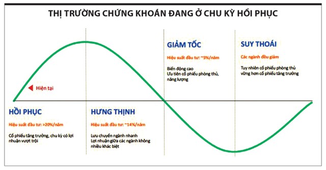 Từ phân tích và những dự phóng cho bức tranh kinh doanh quý I của các doanh nghiệp, dưới góc nhìn của một tổ chức đầu tư am hiểu thị trường Việt Nam, Dragon Capital đánh giá thị trường chứng khoán đang ở chu kỳ hồi phục (biểu đồ). Ở chu kỳ này, sẽ có những ngành nhiều lợi thế hơn, để rồi từ đó, nhà đầu tư có thể tiếp tục chắt lọc được những cái tên tốt nhất cho hành trình đầu tư năm Rồng.
