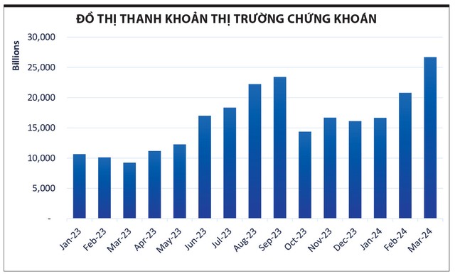 Nhìn trong bức tranh chung, nhóm công ty chứng khoán được dự phóng có kết quả kinh doanh quý I tăng trưởng tốt. Thanh khoản trên thị trường chứng khoán đã tăng dần qua từng tháng (xem đồ thị), tương đồng là giá trị margin tăng mạnh, đem lại nguồn thu từ dịch vụ tài chính tăng cao. Quan trọng hơn, thị giá nhiều cổ phiếu tăng mạnh so với đầu năm nay khiến cho lãi từ đánh giá các tài sản tài chính của công ty chứng khoán vọt lên.