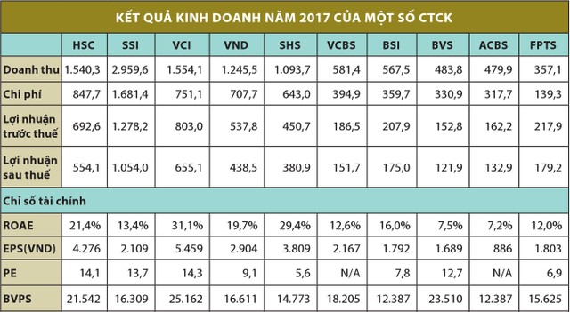 Bên cạnh đó, các CTCK khác trong Top 10 cũng ghi nhận kết quả tốt. Chẳng hạn, VND đạt 438,5 tỷ đồng lợi nhuận sau thuế, tăng 135%, trong khi doanh thu hoạt động tăng 67%, đạt 1.235 tỷ đồng nhờ các hoạt động cho vay margin, môi giới đều tăng vọt. EPS năm 2017 đạt 3.113 đồng. CTCP Chứng khoán Ngân hàng Đầu tư và Phát triển Việt Nam (BSI) ghi nhận doanh thu hoạt động đạt gần 565 tỷ đồng, tăng 37% và lãi ròng ghi nhận 175 tỷ đồng, tăng 45% so với năm 2016.