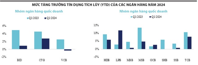 Mặc dù xét mặt bằng chung của ngành ngân hàng, tăng trưởng tín dụng diễn ra chậm chạp, một số ngân hàng vẫn cho thấy mức tăng trưởng tương đối khả quan. Mức tăng trưởng tín dụng trong quý I có đặc điểm là không chạy theo nhóm chiến lược (giữa nhóm quốc doanh, nhóm chuyên cho vay doanh nghiệp và nhóm chuyên cho vay ngân hàng và nhóm còn lại) mà phân hóa theo chính sách quản lý rủi ro của các ngân hàng.