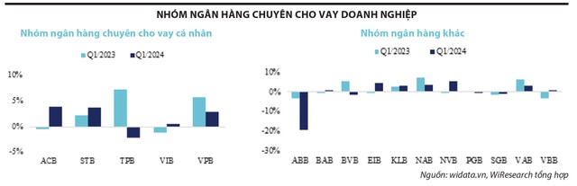 Nhóm chuyên cho vay doanh nghiệp là nhóm có mức tăng trưởng khả quan nhất trong các nhóm ngân hàng. LPBank và OCB là hai ngân hàng có mức tăng trưởng tích lũy tốt hơn so với quý I/2023. Tính đến cuối quý I/2024, dư nợ cho vay của LPBank đạt 308.000 tỷ đồng, tăng trưởng hơn 11,7% so với cuối quý IV/2023.