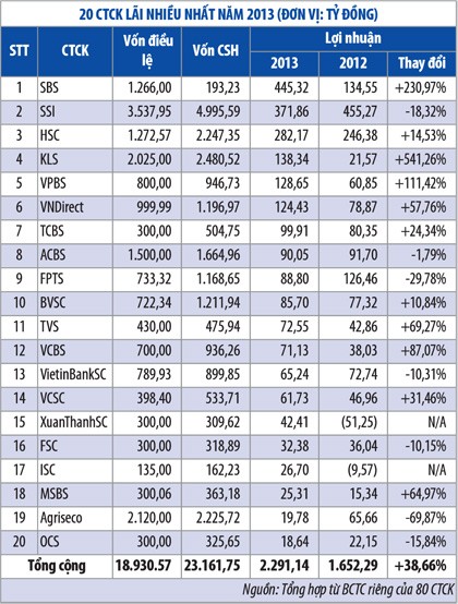 Năm qua, 55 CTCK có lãi với tổng mức lãi ròng hơn 2.444 tỷ đồng, tăng 43,7% so với năm 2012, trong khi 25 CTCK còn lại lỗ hơn 405 tỷ đồng, tức lỗ gấp hơn 2,2 lần năm 2012. Đa số CTCK lỗ trong năm 2013 đã lỗ từ trước đó.